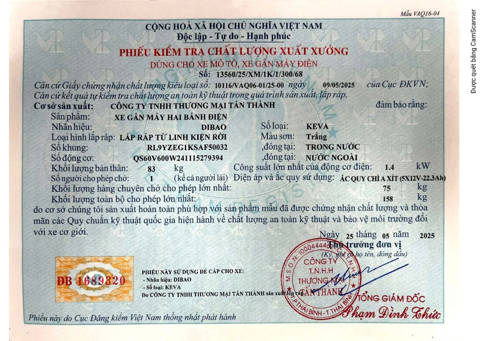 Xe đạp điện Dibao Keva có đầy đủ giấy tờ đăng kiểm và hóa đơn.