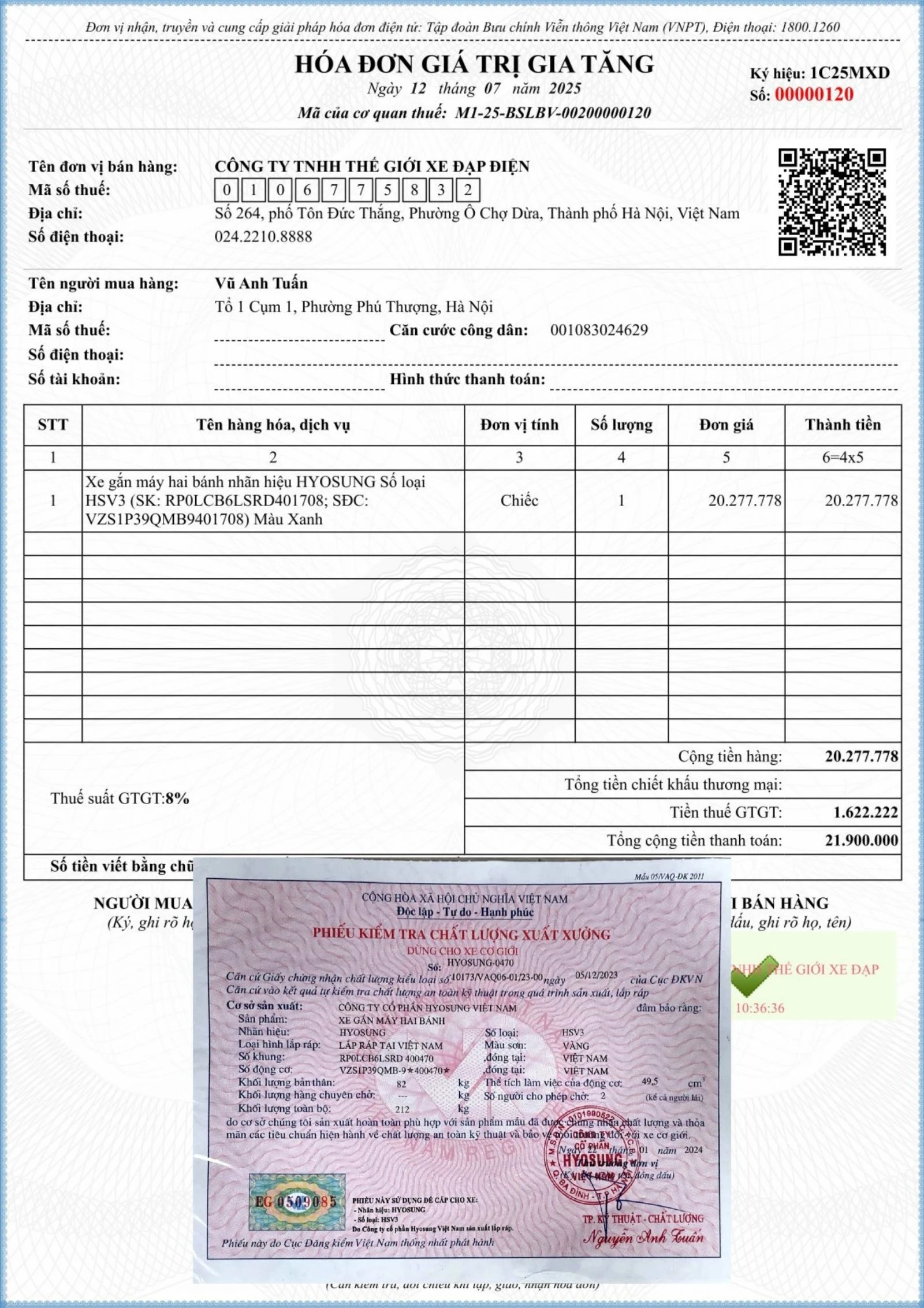 Xe ga 50cc Hyosung HSV 3 có đầy đủ giấy tờ đăng kiểm và hóa đơn.