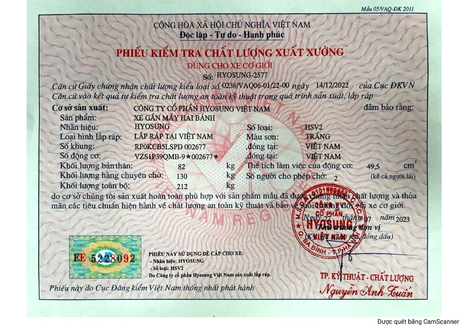 Xe ga 50cc Hyosung HSV2 A có đầy đủ giấy tờ đăng kiểm và hóa đơn.