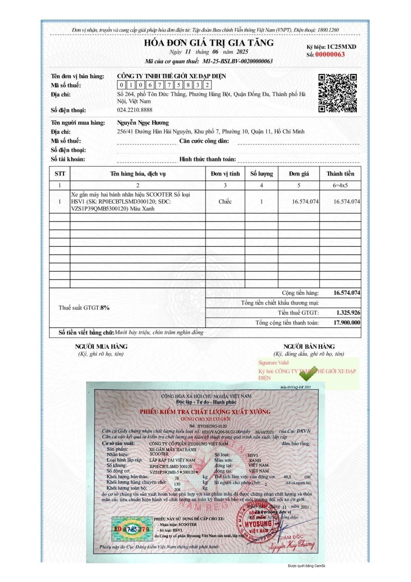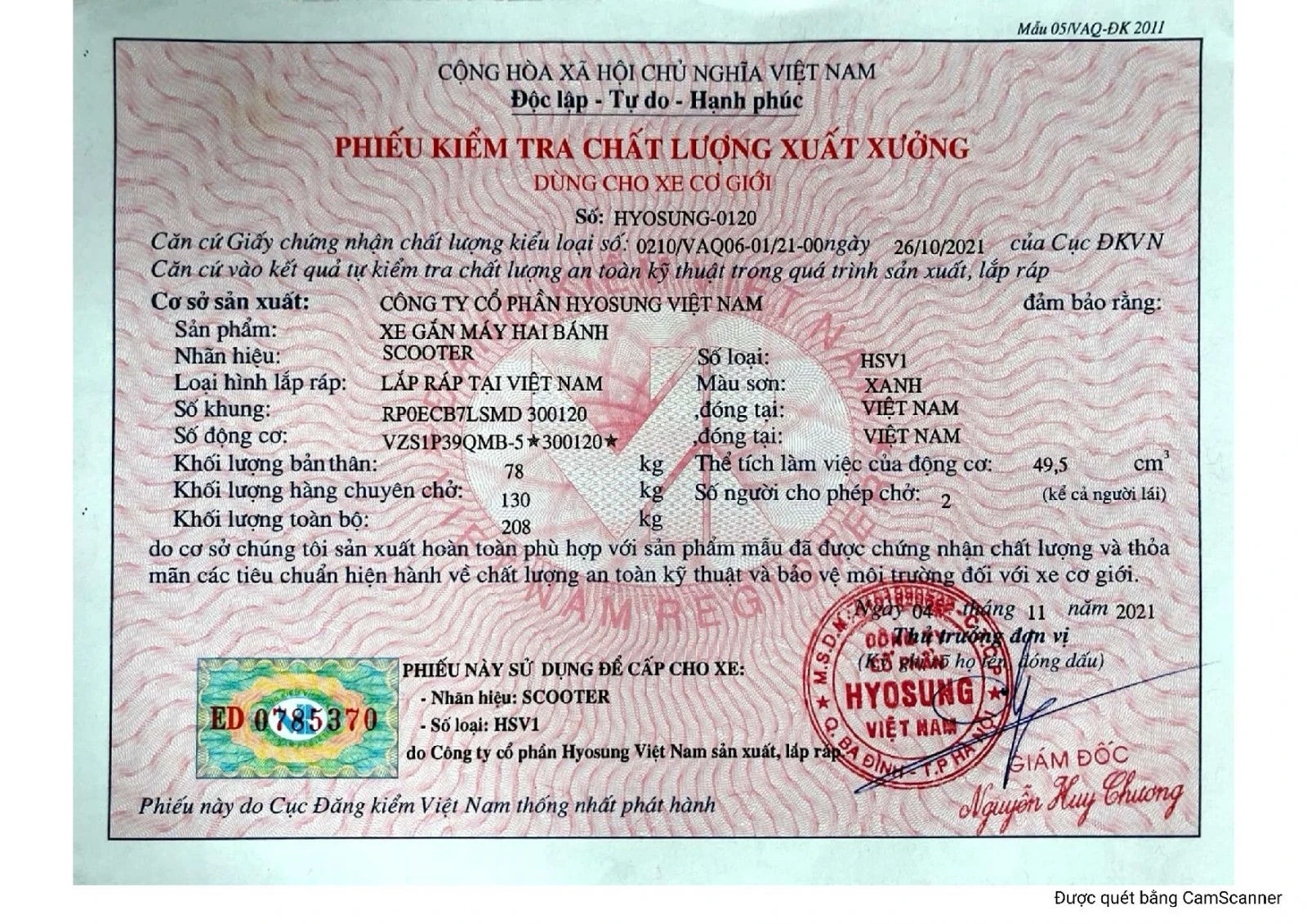 Xe Hyosung Hsv1 co đầy đủ giấy tờ đăng kiểm và hoá đơn