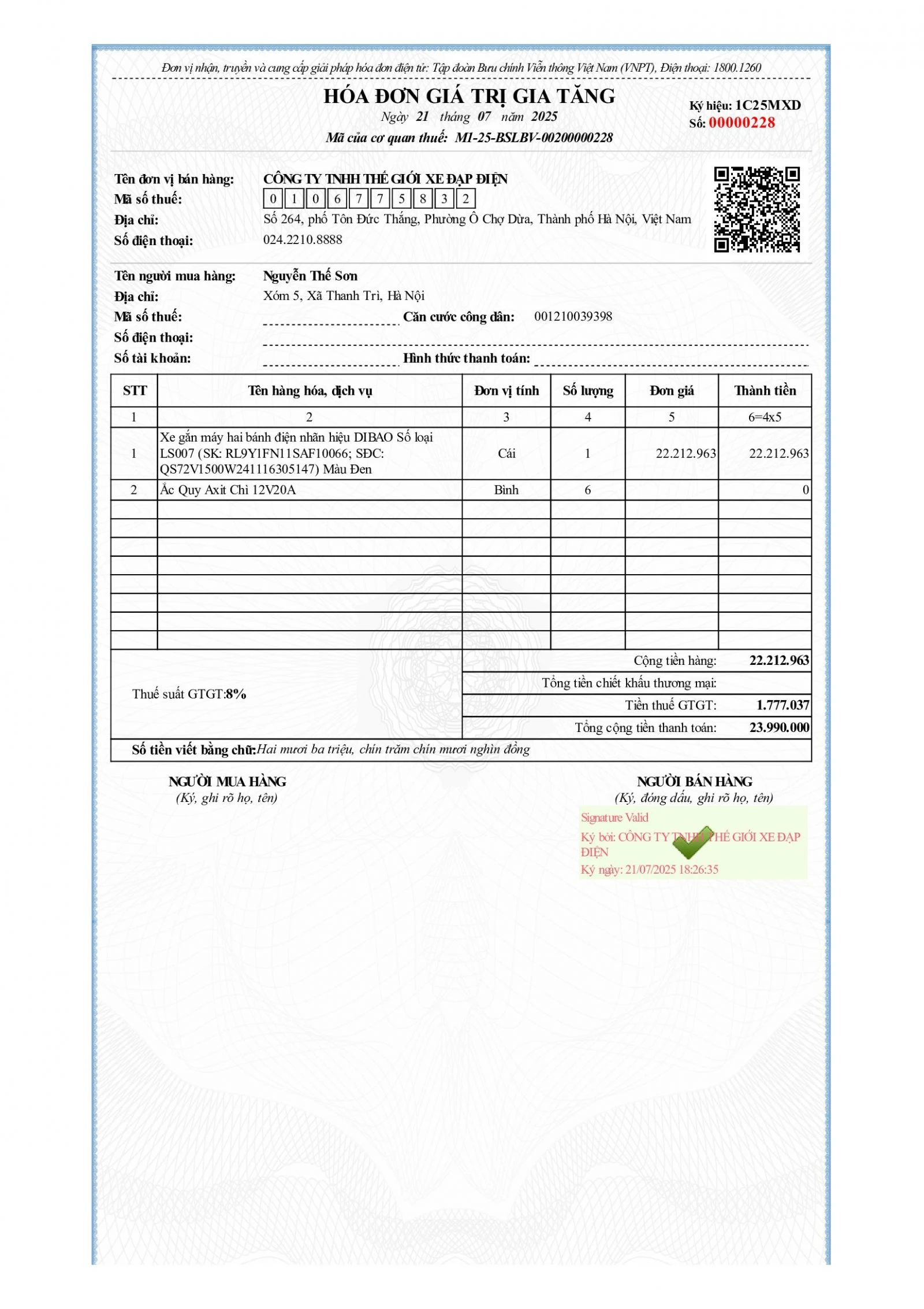 Xe Máy Điện Dibao LS007 có đầy đủ giấy tờ đăng kiểm và hóa đơn.