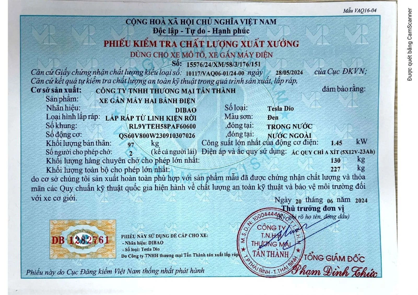 Xe máy điện Dibao Pansy Dio có đầy đủ giấy tờ đăng kiểm và hoá đơn