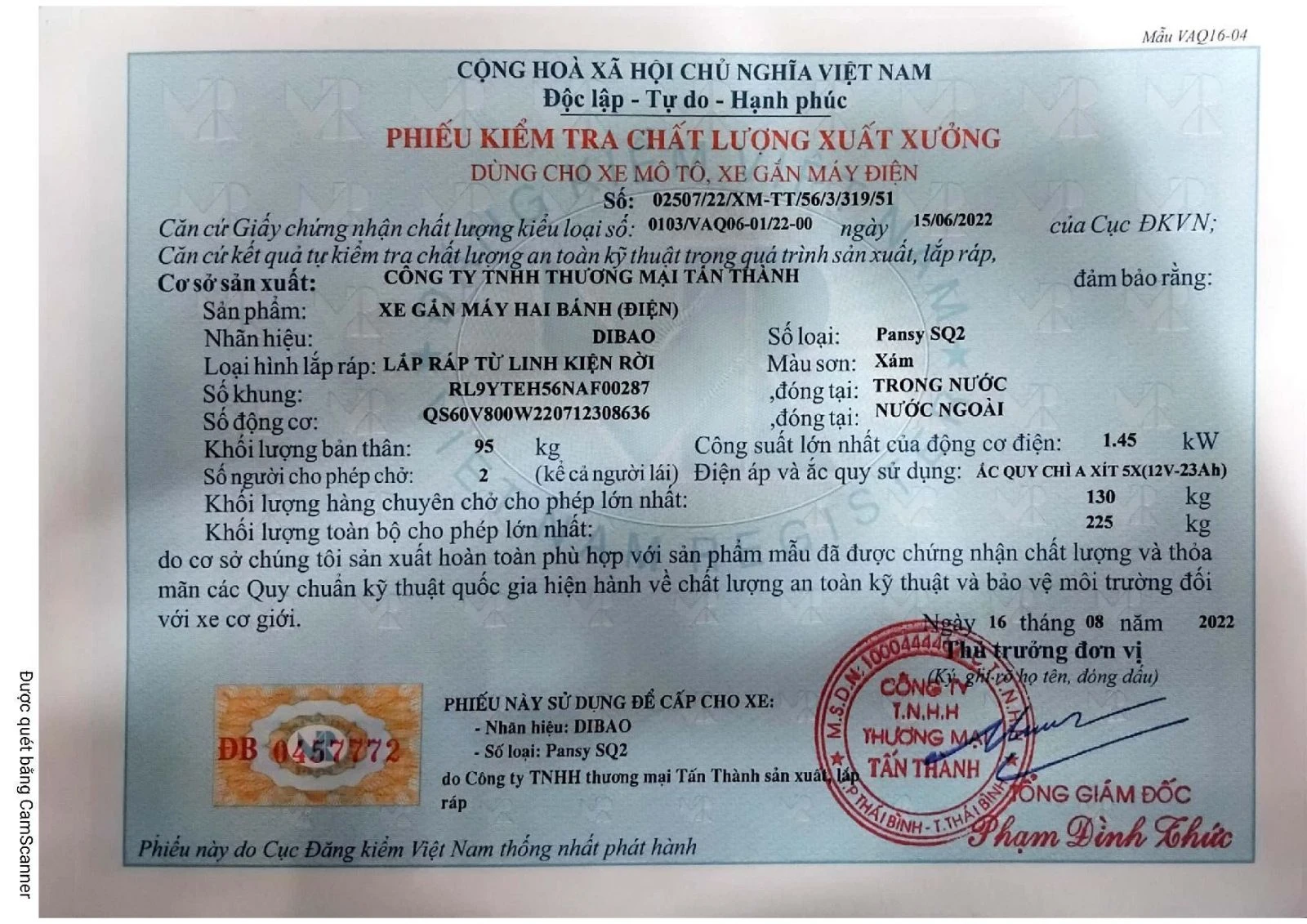 Xe máy điện Dibao Pansy SQ2 có đầy đủ giấy tờ đăng kiểm và hóa đơn