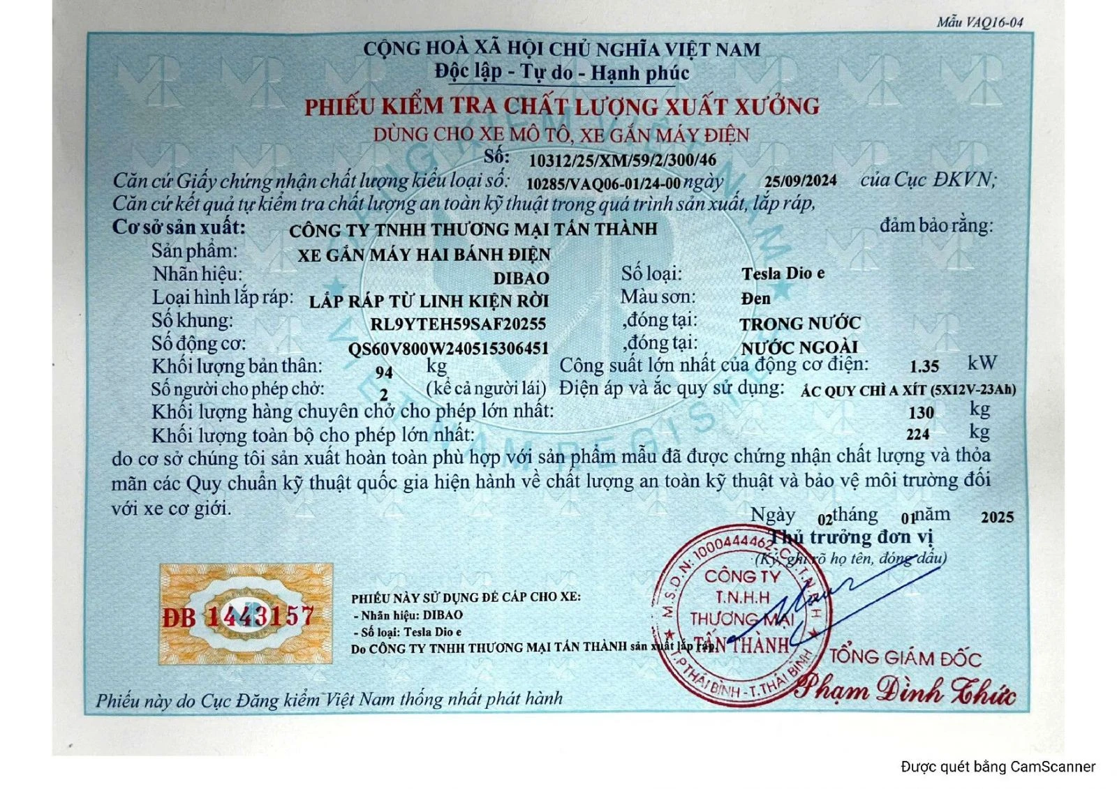 Xe máy điện Dibao Tesla Dio E có đầy đủ giấy tờ và hóa đơn