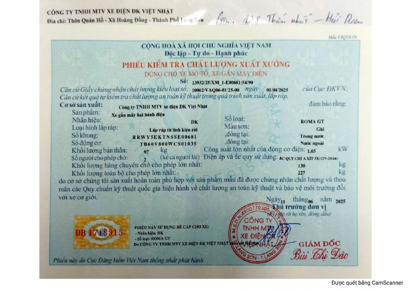 Xe Máy Điện DK Bike Roma GT có đầy đủ giấy tờ đăng kiểm và hóa đơn