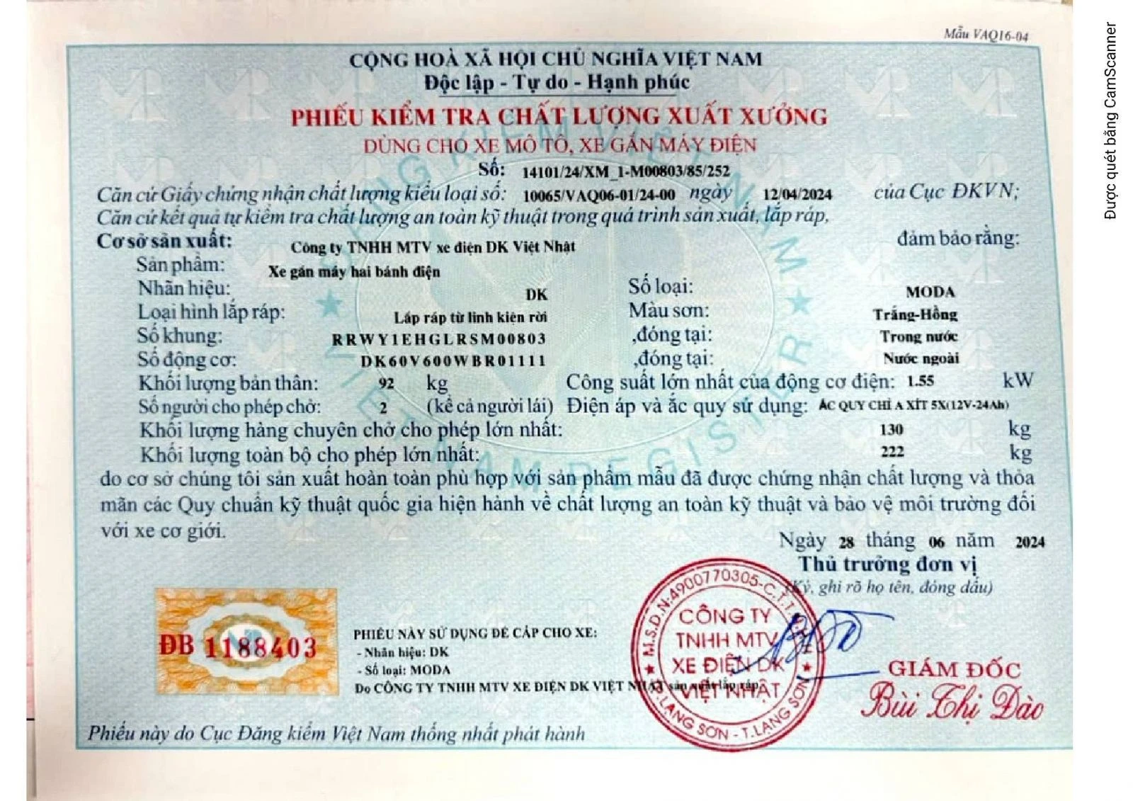 Xe Máy Điện DK Lyva Moda có đầy đủ giấy tờ đăng kiểm và hóa đơn.