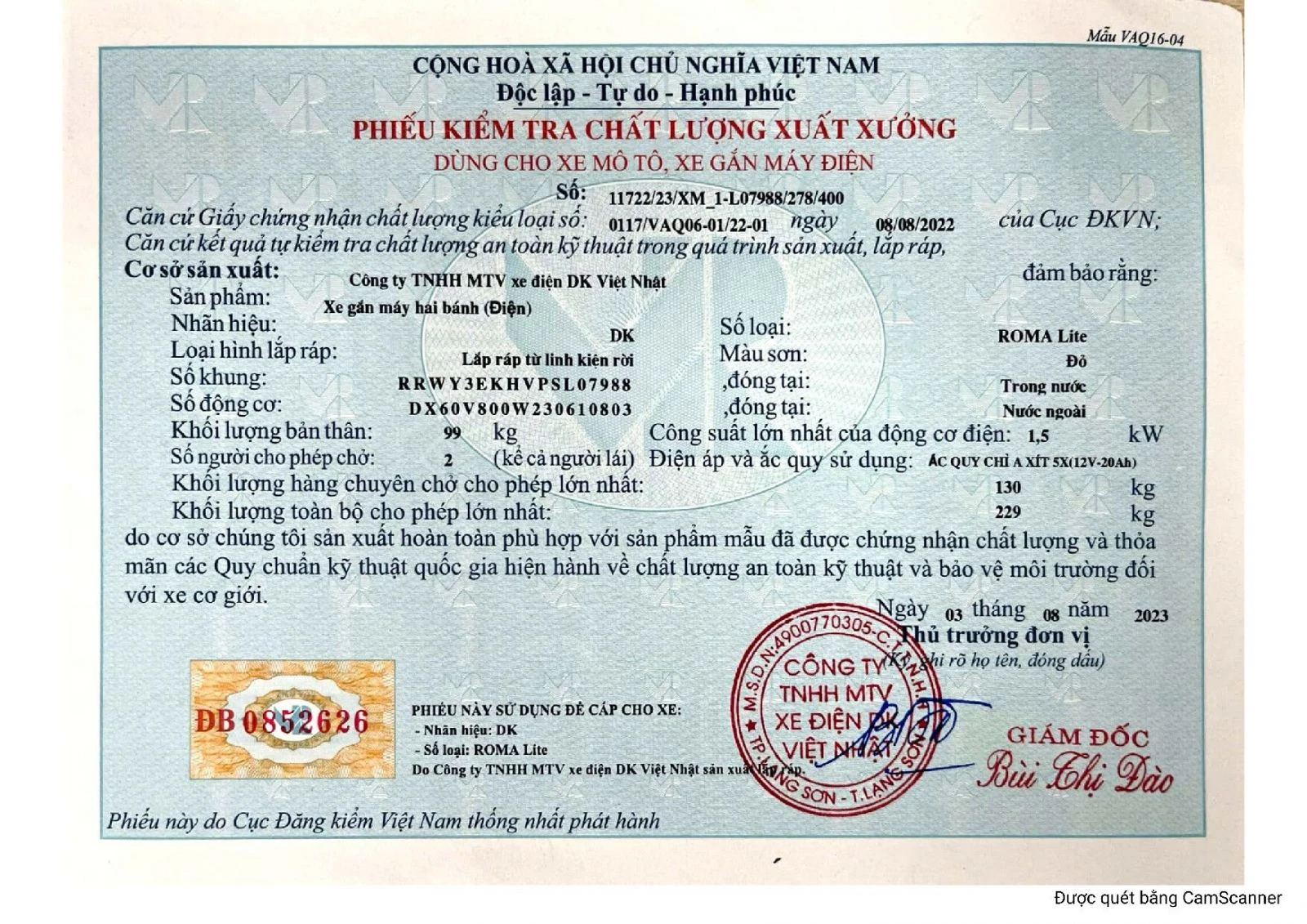 Xe máy điện DK Roma Lite có đầy đủ giấy tờ đăng kiểm và hoá đơn