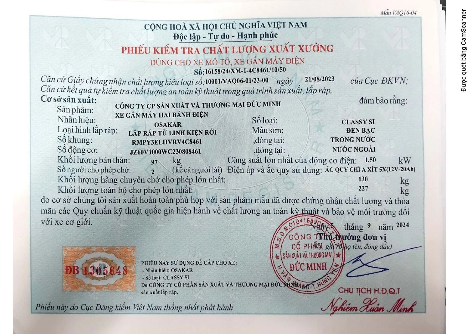 Xe máy điện Osakar Classy SI có đầy đủ giấy tờ đăng kiểm và hóa đơn